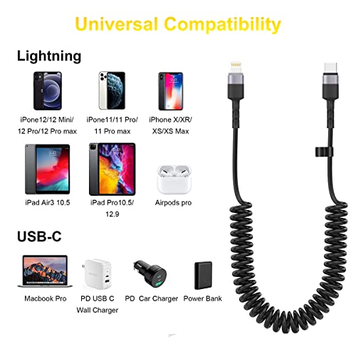 【Cavo di ricarica retrattile 3M / 10FT】 Il cavo USB Lightning per auto con design a forma di molla, portatile senza twining. Fornisce la lunghezza ragionevole del cavo della molla in grado di facilitare la ricarica sul copilota o sul sedile posteriore. Allungalo quanto vuoi (lunghezza di trazione: 2-10FT). La lunghezza è ideale per l'utilizzo a lunga distanza a casa, in ufficio, in auto, in viaggio e in altri luoghi.