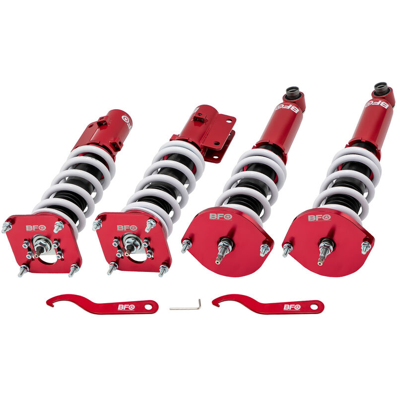 Per Mazda RX7 Coilover Details Fit for For Mazda RX-7/ for Mazda Savanna RX-7 second generation FC3S 1985-1992 2 door coupe/2 door convertible Item Specific Top mount: Front camber plate;rear pillow ball Damping: 24 levels rebound damping adjustable Spring rate Front: 10 kg/mm (560 lbs/in) Spring rate Rear: 8 kg/mm (448 lbs/in) Adjustable height: lowering 1-3 inch Shock type: Twin tube Spring Preload: 7-10 mm Color: Red body with white spring Features 1. Lowered height adjustment from 1" - 3" which allow lower center of gravity and also add a more aggressive stance. 2. A 24 rebound damping adjustment level allows you the ability to perfectly dial in your coilover setup. You will experience better ride quality in all road conditions. 3.Camber plate top mounts help to eliminate the need for a separate camber kit. 4.Twin-Tube structure allows sufficient stroke within the shock absorber. 5.Complete Suspension Kit of 4 Shock Absorbers & 4 Springs for an easy installation. 6.Separate
