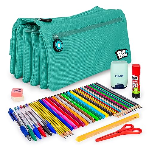ColePack - Set di Astuccio Scolastico Quadruplo con 4 Cerniere e Materiale Scolastico delle Migliori Marche Incluso (Turchese)