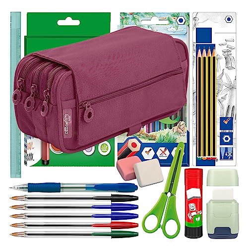 ColePack - Set di Astuccio Scolastico Triplo con 3 Cerniere e Materiale Scolastico delle Migliori Marche Incluso (Viola)