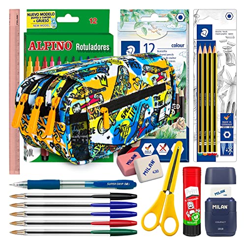 ColePack Design - Set di Astuccio Scolastico Triplo con 3 Cerniere e Materiale Scolastico delle Migliori Marche Incluso (Street)