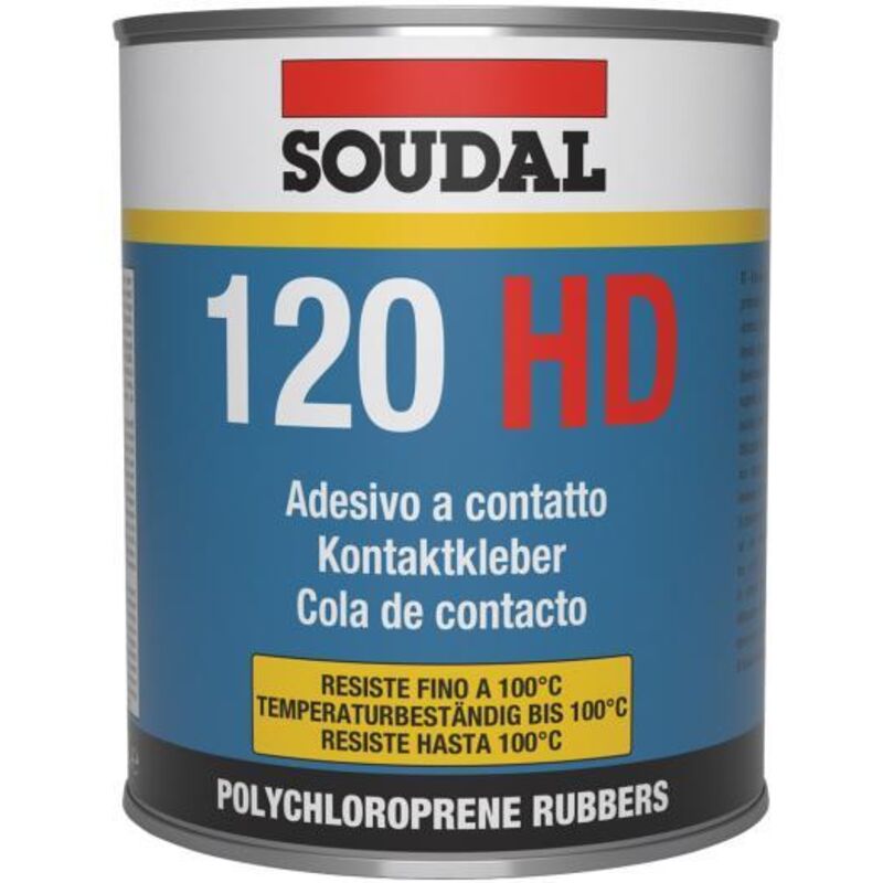 Adesivo a contatto pronto all'uso, base solvente gomma polychloroprenica. 120HD Š un adesivo a contatto per uso professionale. Alta adesione iniziale. Rapido indurimento. Resistente all'umidit.... Resistenza alle alte temperature. Applicazione: Incollaggio di molti materiali come metalli, gomma, plastica, cuoio, legno, gomma, cuoio, sughero, plastica, feltro, ecc. Su vari tipi di substrati o tra di loro. Incollaggio di pannelli decorativi sintetici e piani di lavoro in legno, metallo o cartone.