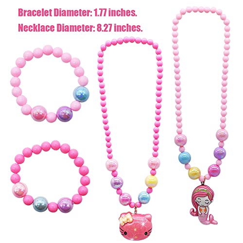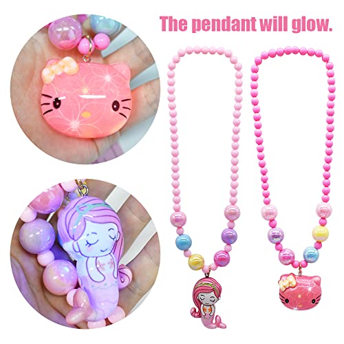 Collana e Bracciale con Perline per Bambini, 2 Set, Parure di Gioielli con Ciondolo Gatto e Sirena,il Ciondolo si Illuminerà