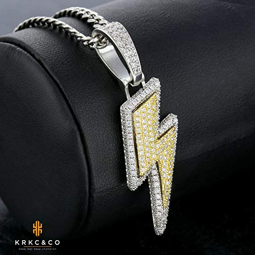 KRKC&CO Collana con Ciondolo con Ciondolo a Forma di Flash Iced out, 3 mm, 61 cm, placcata in Oro Bianco con Ciondolo a Forma di cubo, con Flash Iced out Flash, in Argento