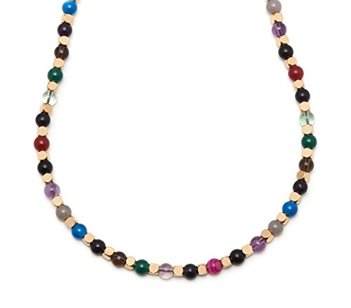 Questa collana è costituita da un mix di agata verde, ametista, agata grigia, blu agata persiano, nero ossidiana, agata rosa persiana, Rainbow fluorite, arenaria blu, quarzo fumé e ametista lavanda con perline in metallo color oro.