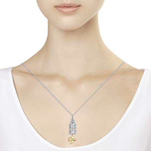 Collana originale con ciondolo plissettato a forma di gabbia voluminosa e uccello dorato in catena d'argento.