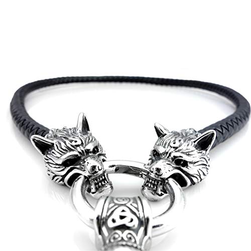 Collana vichingo in pelle con ciondolo a forma di martello di Thor e testa del lupo Fenris.