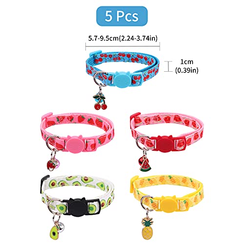 ►►Adorabili modelli di frutta estiva - Il kit di collari per gatti regolabili include 5 collari per gatti di diversi colori con campanelli e ciondoli di frutta, i modelli sono fragola, ciliegia, avocado, anguria, ananas, i colori sono luminosi.