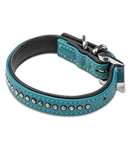 Collare per cani in vera pelle con strass/cristalli - Collare scintillante per cani e gatti in pelle di bufalo imbottita e a doppio strato - Collare in pelle Audrey (XS (19,0 - 23,5 cm), turchese)