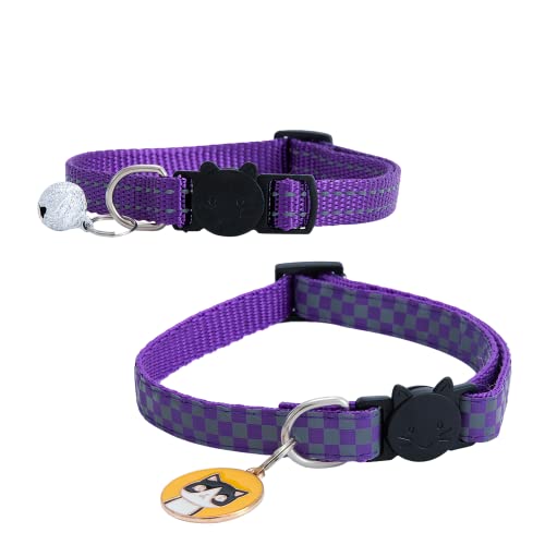 Crea Set di due collari regolabili per gatti, con sonaglio/medaglietta e clip antistrozzo di sicurezza.Intercambiabili per ogni occasione. (PURPLE)