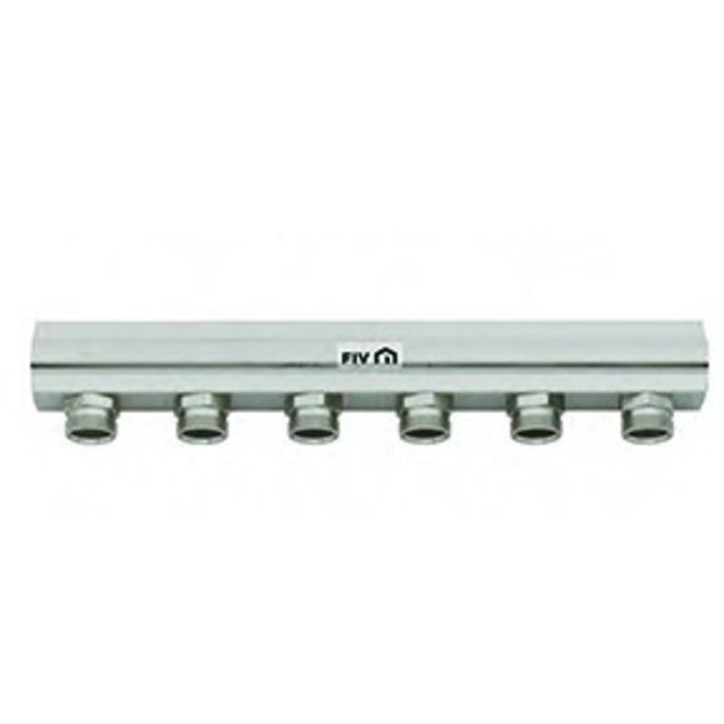 Collettore di distribuzione nichelato da 1 completo di raccordi di derivazione 24x19, con foro superiore per valvola di sfiato. Interasse derivazioni 50 mm. GP2750 CONTROLLER. Denominazione Collettore Materiale UNI EN 12168 CW614N.(DianFlex)Misura: 1 x 6 Vie L. 314 mm