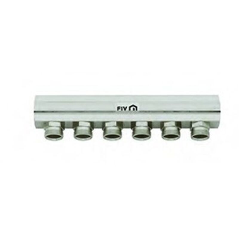 Collettore di distribuzione nichelato da 3/4 completo di raccordi di derivazione 24x19, con foro superiore per valvola di sfiato. Interasse derivazioni 36 mm. GP2750 CONTROLLER. Collettori Materiale UNI EN 12168 CW614N.(DianFlex)Misura: 3/4 x 11 Vie L. 409