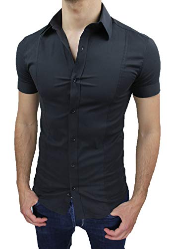 AK collezioni Camicia Uomo Slim Fit Nero Aderente Elasticizzata Manica Corta Casual