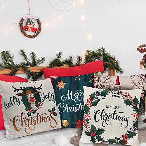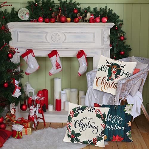 Colmanda 4 Pack Fodera per cuscino di Natale, Fodere per Cuscini Decorate, Federa Natalizia in Cotone e Lino, Christmas Fodere per Cuscini, Copricuscini Decorativi Natalizia, 45x45 cm (verde)