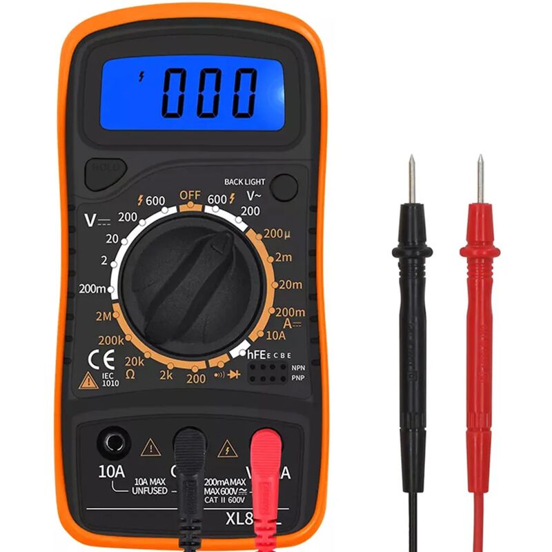 Multimetro digitale XL830L per la misurazione di tensione CA, CC, amplificatori, ohm e hFE di transistor con puntale di prova. < p>È ricco di funzionalità per aiutarti a diagnosticare, rilevare, aggiornare o controllare correttamente tutti i dispositivi elettrici a casa e al lavoro. Le sue dimensioni ridotte ti consentono di portarlo ovunque e, grazie alla sua struttura robusta, è resiste a tutti gli inconvenienti della postazione di lavoro. Vantaggi del prodotto Misura di corrente continua e alternata (DC, AC) < li>Misurazione della tensione CC e CA Misurazione della continuità del circuito Misurazione della resistenza Misurazione HFE dei transistor, Realizzato in plastica di alta qualità, Dispone di un ampio display LCD retroilluminato blu di facile lettura. < p> Specifiche DCV range di tensione: 200mV - 200V (+/- 0,8%+3), 1000V (+/- 0, 8%+4), < li>Intervallo di tensione ACV: 200mV (+/- 1,2%+3), 2V - 200V (+/- 0,8%+3), 750 V (+/- 1,2%+3), Intervallo di tensione ACA: 200uA