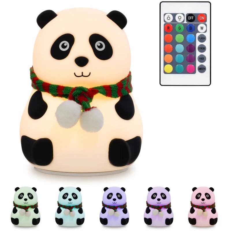 BUONA NOTTE: la lampada da comodino per bambini dal simpatico panda è la soluzione ideale per far addormentare serenamente il tuo bambino in serata. La piacevole luce della lampada non è troppo intensa. MAGIC: La luce notturna nella stanza dei bambini può essere azionata tramite il pulsante in basso o il telecomando. Inoltre, la luce notturna ha un sensore tattile, che ti consente di selezionare le modalità tramite tocco. DETTAGLI TECNICI: Oltre alla lampada Panda, riceverai un telecomando e un cavo micro-USB, con cui viene caricata la batteria agli ioni di litio integrata del leggero sussidio per dormire per bambini. COLORE: oltre alla luce bianca calda della luce notturna, puoi anche impostare la funzione di cambio colore. colore della lampada da letto, passa automaticamente tra i colori RGB, imposta il colore desiderato e controlla la luminosità. LA SICUREZZA PRIMA DI TUTTO: poiché la luce notturna a LED è realizzata in morbido silicone, è più robusta delle altre luci notturne.