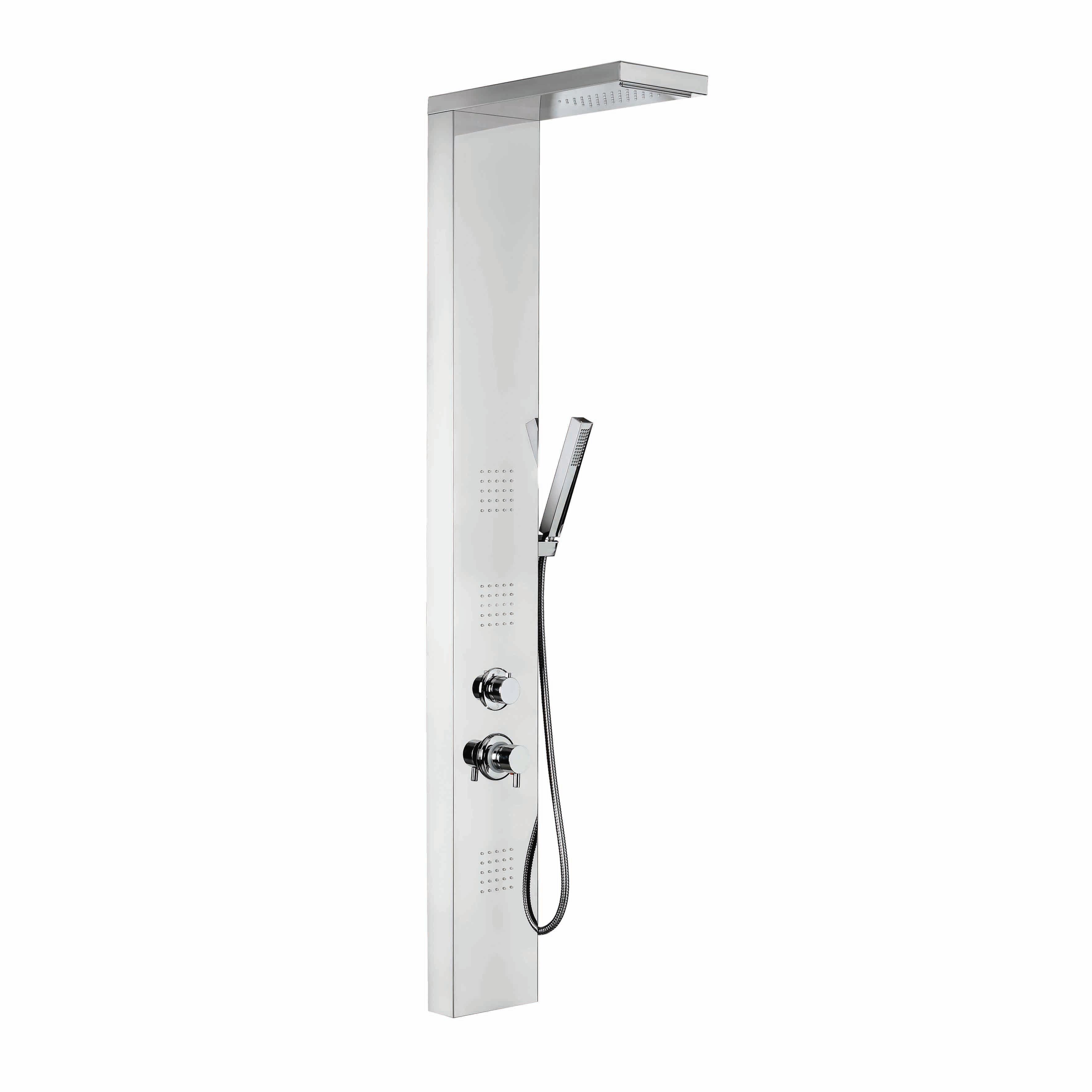 L 20 x H 160 x P 48 cm. Soffione integrato e doccetta in abs, ugelli in silicone e getto a cascata e pioggia con miscelatore meccanico. Indicato per le docce di medie e grandi dimensioni. Il numero di getti permette di massaggiare nello stesso momento un'area piu ampia del corpo. Soffione ispezionabile per una manutenzione più facile. Soffione effetto cascata