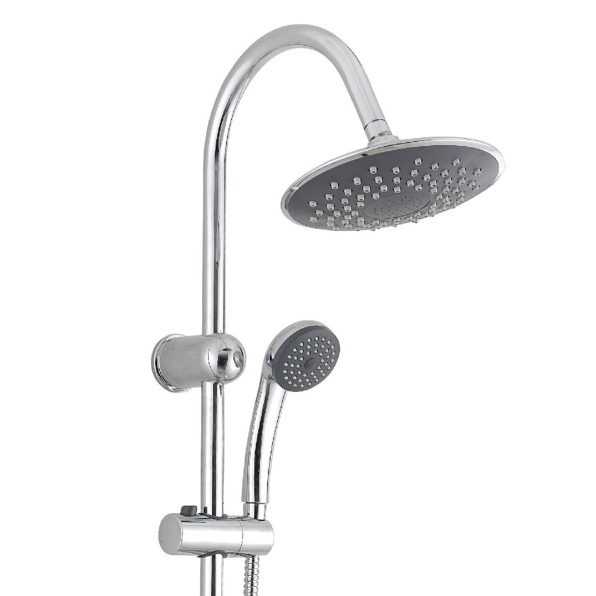 Soffione orientabile rotondo 20 cm, 1 getto e doccetta in ABS. Asta in ottone cromato lucido con miscelatore manuale integrato.. Per una manutenzione ottimale del prodotto, si raccomanda di pulire regolarmente gli ugelli e le superfici con un panno morbido, utilizzando detergenti delicati.