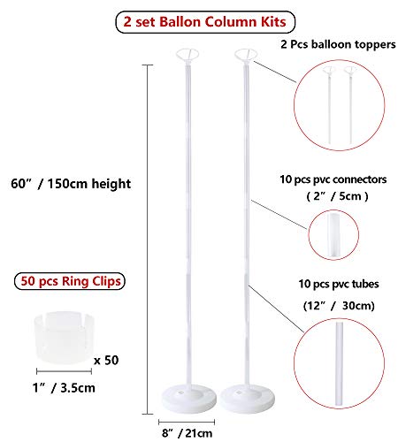 Dimensioni del kit: l'altezza del kit a colonna a palloncino è di 1,5 m di altezza, contiene 2 basi per pesi d'acqua (20 cm di diametro), 10 tubi (28 cm/per), 10 connettori (6 cm/per), 50 clip per palloncini, 2 tazze per palloncini con tubo. Ogni supporto per palloncini misura circa 18 x 70 cm, contiene 11 tubi, 7 tazze e 1 base. La clip a forma di palloncino misura circa 7 cm di diametro. La lunghezza totale del kit per ghirlanda ad arco a palloncino è di 5 m.