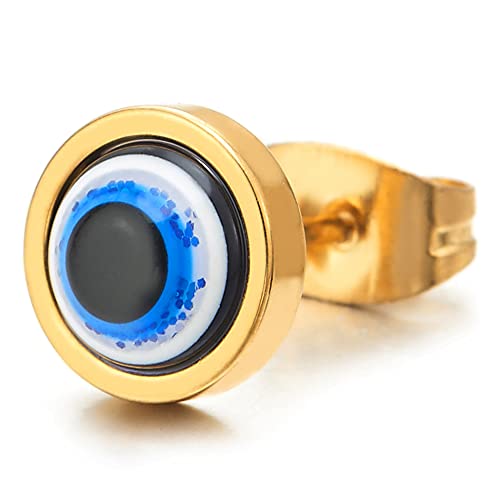 8MM Colore Oro Cupola Cerchio Pulsante Orecchini con Bianco Blu Malocchio, Uomo Donna, Acciaio Inossidabile, 1 coppia