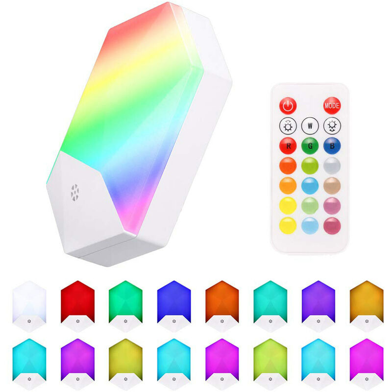 Le luci notturne a LED RGB sono piacevoli nell'illuminazione. Il controller è progettato per l'accensione/spegnimento, l'impostazione di diverse luminosità, la modifica di 16 colori chiari e l'impostazione di 4 modalità dinamiche. Specifiche: Tensione in ingresso: A C100-240V Consumo: 1w Sorgente luminosa: LED Modalità di illuminazione: regolazione continua, 16 colori che cambiano, 4 modalità di illuminazione dinamica Distanza effettiva del controller: 3- 7 metri Batteria del telecomando: 1 * 3V 150mAh CR2025 Materiale: ABS Quantità articolo: 1 pz/2 pz ( opzionale) Tipo di spina: EU/US/UK (opzionale) Dimensione articolo (1 pz): 100 * 60 * 27 mm/ 3,9 * 2,4 * 1,1 pollici (Lunghezza * Larghezza * Altezza) br />Peso della confezione: 100 g (1 pezzo)/ 170 g (2 pezzi) Nota: Questo articolo non è impermeabile, si prega di usarlo con attenzione. Elenco dei pacchetti:(Opzionale) 1 pz: 1 * Luci 1 * Controller