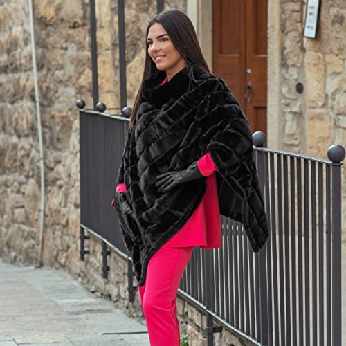 CALDO E MORBIDO IN TAGLIA UNICA Questo poncho NERO in pelliccia di poliestere da donna è caldo e morbido: La pelliccia sintetica conferisce al capo una classe senza tempo. La taglia è unica, lunghezza cm 85, si adatta alla maggior parte delle donne