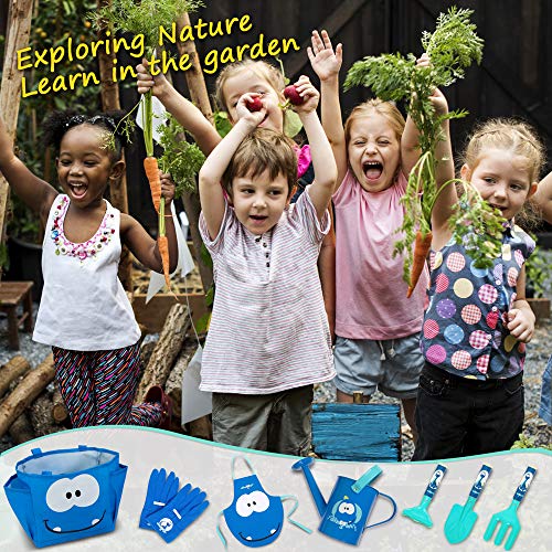 Colwelt Set da giardinaggio per bambini, 6 attrezzi da giardinaggio per bambini con annaffiatoio sicuro per bambini, forchetta, rastrello, cazzuola, grembiule per bambini, guanti, borsa da