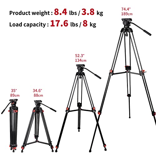COMAN treppiede fotocamera da 188 cm Robusto treppiede per videocamera professionale Borsa per il trasporto da 8 kg Inclusa piastra a sgancio rapido, cavalletto fotografico tripod