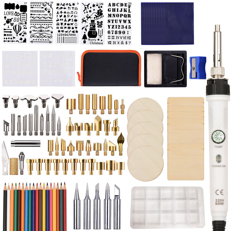 Specifiche: Materiale: plastica + Metallo Tensione di ingresso: AC 220V(US), 110V(EU), 50/60Hz Potenza: 60W Temperature: 200-480 ℃ Dimensioni confezione: 26,5 x 14,5 x 6,5 cm/10,4 x 5,7 x 2,5 pollici Peso confezione: 722 g/25,5 once Lista di imballaggio: 1 x penna pirografica 1 x portapenne 18 x Matita colorata 1 x Temperamatite 5 x Tavole di legno tonde 5 x Tavole di legno quadrate 5 x Punta per saldatore 5 x stencil 53 x punta per bruciare il legno 10 x carta carbone 1 x custodia Borsa