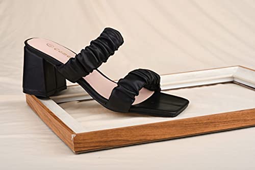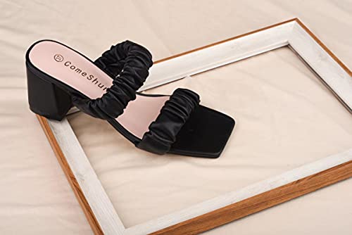 ComeShun Donne Basso Blocco Tacchi Muli Open Toe Cinturino alla caviglia Sandali Due Con Fascia Arricciata Punta Quadrata Pompe, Nero, 38 EU