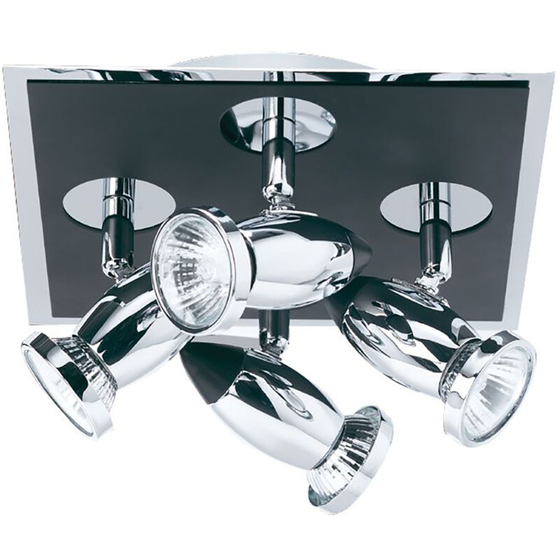 Collezione Cometa ILLUMINAZIONE PERFETTA Il faretto a 4 luci Comet nero con finiture cromate è moderno, elegante e illumina perfettamente qualsiasi camera da letto, soggiorno, sala da pranzo o cucina. L'elegante piastra da soffitto quadrata con finitura nera e cromata è molto contemporanea e la finitura cromata lucida ha un aspetto sorprendente, inoltre i quattro faretti possono essere regolati e ruotati attorno al raccordo quadrato, praticamente in qualsiasi posizione. **QUESTO PRODOTTO ACCETTA UN MAX 7W LED o 50w ALOGENO GU10**.