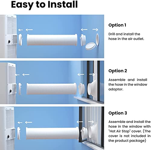 Accessori inclusi: tubo di scarico (lunghezza 130 o 150 cm), telecomando, finestra scorrevole, adattatore per apertura a parete, guarnizioni in schiuma e accessori di montaggio completi. Codice WEEE: DE55703080