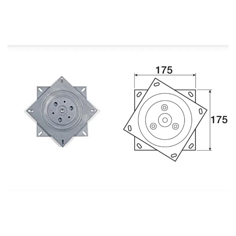 Piatra girevole montata su sfere. Finitura: zincata Portata: 100 Kg Dimenzione piastra: 175x175 Altezza: 12 mm