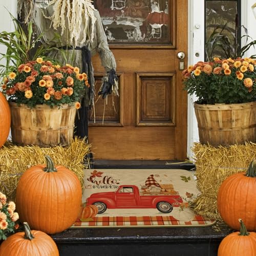 Comfoyar Hello Pumpkin Zerbino Ingresso Casa da Esterno, Tappeto Entrata Interno, Antiscivolo, Resistente Sporco, Lavabile, Tappeto da Esterno, 43 x 75 cm, Gnomi e Camion Rosso