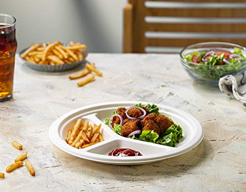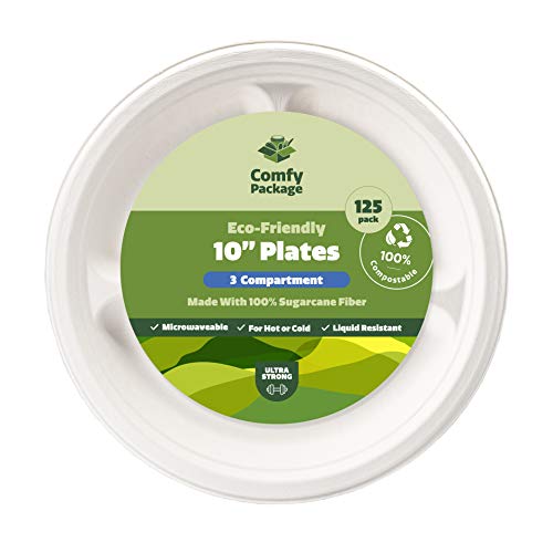 Comfy Package [125 pezzi - 25,5 cm] Piatti monouso 100% compostabili in bagassa di canna da zucchero - ecologici e resistenti - a 3 scomparti