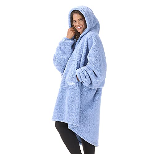 Tutto Enorme: È gigante, ed è come dovrebbe essere! Abbiamo iniziato con una 5XL da uomo e da lì siamo solo diventati più grandi. Con un enorme cappuccio in peluche, tasca a marsupioTM, maniche fuori misura ed orlo alto-basso, The Comfy è come essere abbracciato da una nuvola! Infila dentro le gambe, solleva il cappuccio o cammina liberamente mentre indossi il calore della tua coperta ovunque tu vada. Ora puoi davvero indossare la tua coperta ovunque!