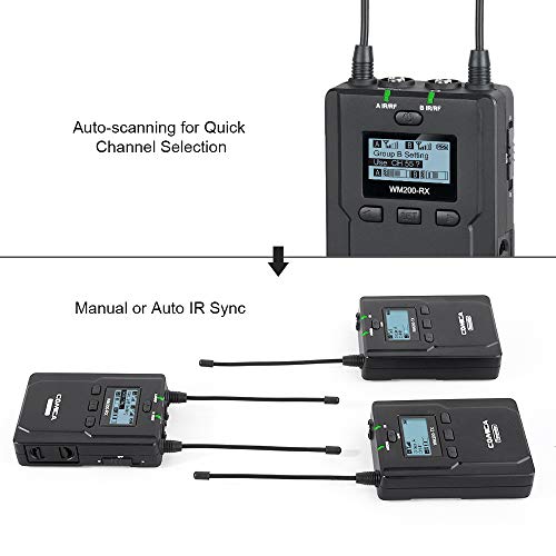 Comica microfono senza fili lavalier CVM-WM200A 84 canali professionali UHF wireless Lav Lapel Mic System per Sony Canon Nikon Panasonic Fuji DSLR Camera,Videocamere XLR,Smartphone