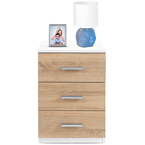 COMIFORT Comodino - Tavolino per la Camera da Letto in Stile Nordico, Moderno e Minimalista, con 3 Spaziosi Cassetti, Molto Resistente, di Colore Bianco e Rovere Sonoma