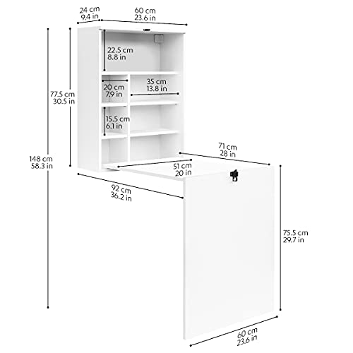COMIFORT Scrivania da Parete - Tavolo da Muro con Pieghevole con Libreria - Struttura Solida, Moderna e Minimalista, con Mensole Spaziose e di Gran Capienza, Colore Bianco