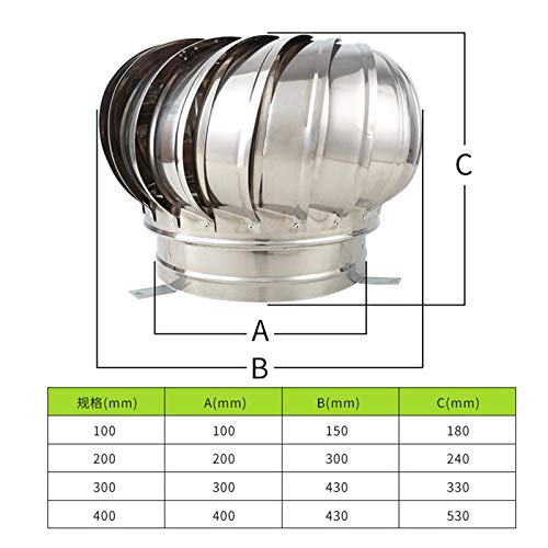 VENTILATORE A TURBINA ROTANTE: il diametro della base si adatta alla maggior parte dei camini standard con diametro di base di 100 mm, 110 mm, 150 mm, 160 mm, 200 mm si adatta a comignoli standard, robusta struttura in acciaio inossidabile