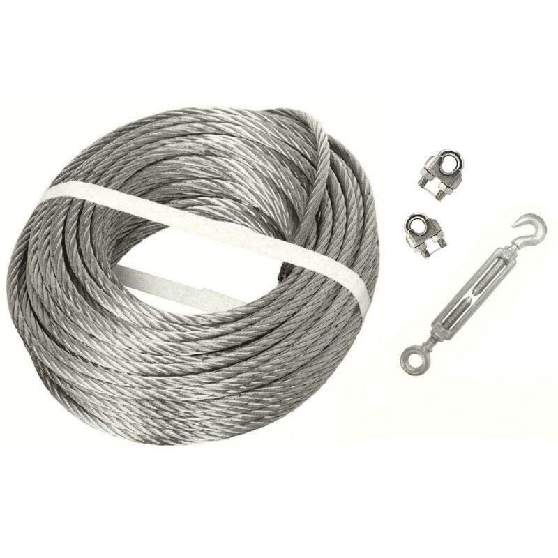 KIT FUNE COMMERCIALE + TENDITORE MORSETTO ACCIAIO OCCHIO GANCIO VERRICELLO 8 MM 100 MT KIT COMPOSTO DA FUNE IN ACCIAIO ZINCATA AVENTE DIAMETRO 8 mm FORMAZIONE: 72 fili (6x12+7AT) CARICO DI ROTTURA: + 2000 Kg LUNGHEZZA FUNE: 100 metri + TENDITORE OCCHIO-GANCIO IN ACCIAIO ZINCATO 8 mm + 4X MORSETTI PER FUNE ACCIAIO ZINCATO 8 mm
