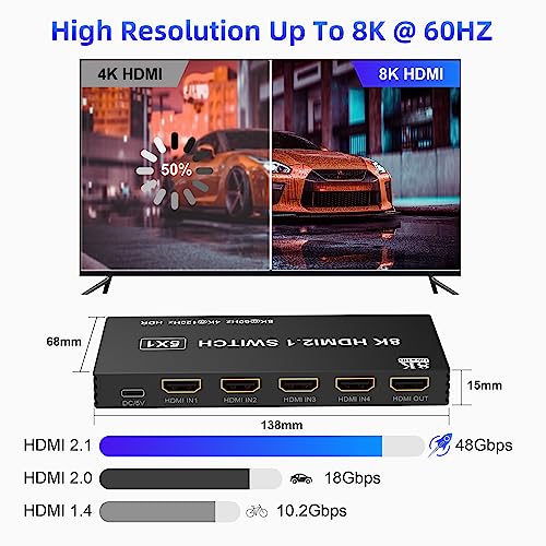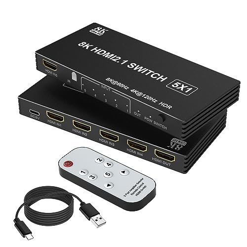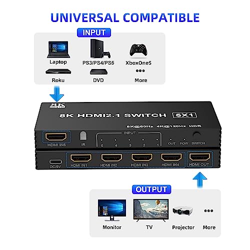 Commutatore HDMI 5 in 1 Out 8K@60Hz, 5×1 HDMI 2.1 Selector Box con telecomando IR, 5 porte HDMI Switcher Splitter per PS5 PS4 Xbox PC TV