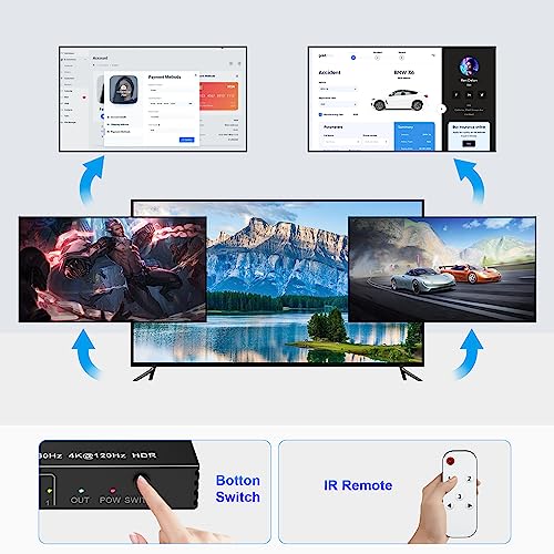 Switch HDMI 5 in 1 out: Lo switch HDMI a 5 porte con telecomando consente la commutazione automatica tra 5 risorse di segnale su un unico display, condividendo video e audio attraverso un unico display HDMI, senza lag, flash e sfarfallii dello schermo. Facile da collegare, non perde il segnale e dura a lungo, è più comodo per l'uso in famiglia.