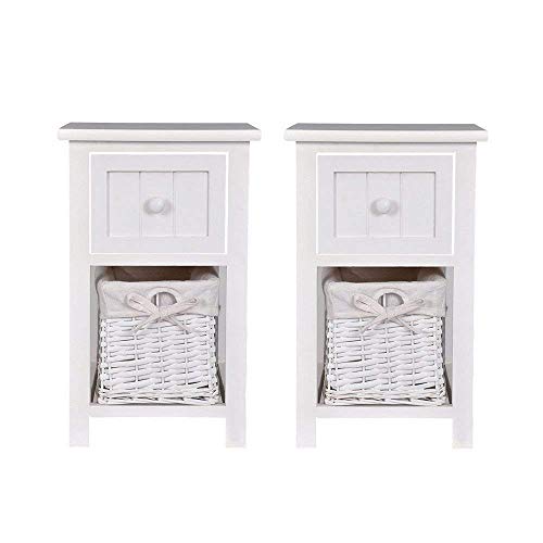 Set di due comodini con cassettiera shabby chic, comodino con cassetti in stile tradizionale con ceste in vimini, bianco shabby chic comodino con cassetti in vimini. Pre assemblato.