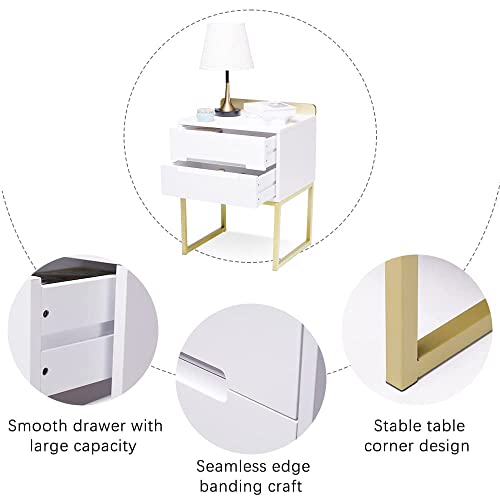 Comodino in legno con due cassetti, assemblato, con gambe in metallo, per camera da letto e soggiorno, colore oro bianco