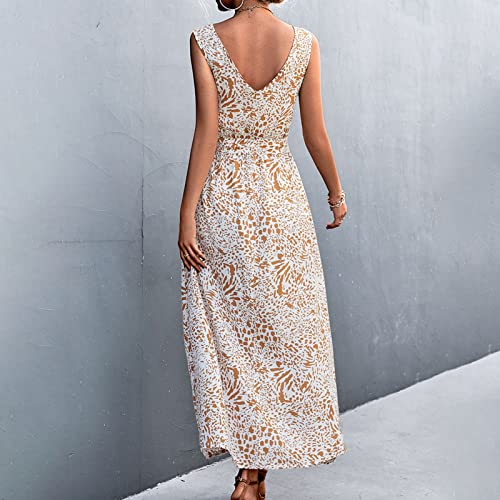 Comodo Abito Lungo Floreale Estivo da Donna, Maxi Abito, Abito Estivo Ampio, Elegante Abito da Spiaggia, Abito da Sera con Scollo a V, Abito Casual Senza Maniche(S-Albicocca)