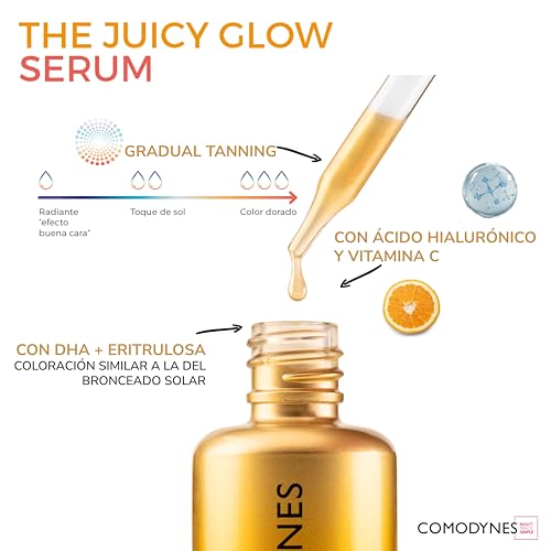 Comodynes - Juicy Glow Siero autoabbronzante graduale, idrata, illumina e riduce i segni dell'invecchiamento, migliora l'elasticità e la compattezza, con acido ialuronico e vitamina C - 30 ml