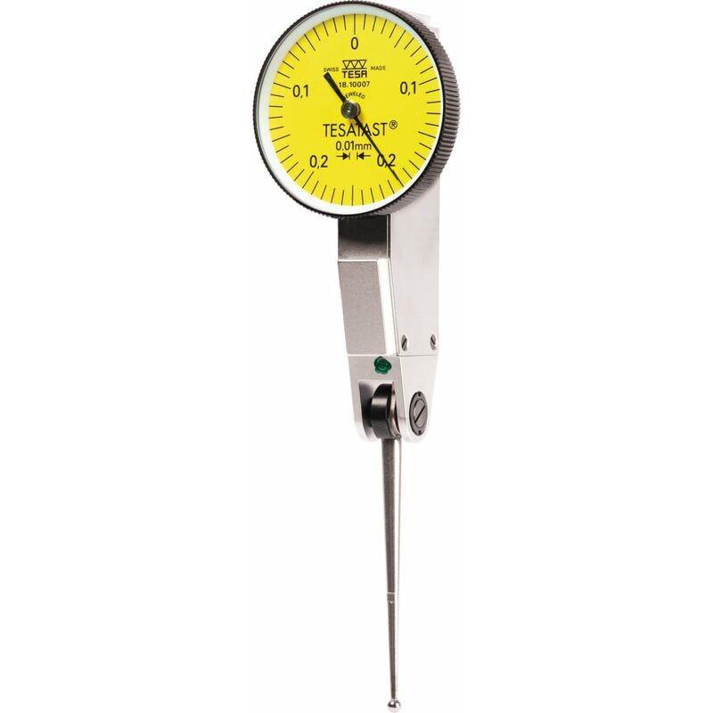 Tastatori a leva di alta precisione con meccanismo montato su rubini in esecuzione robusta e funzionale. Il corpo e i prismi a coda di rondine sono realizzati in un pezzo unico, assicurando la massima rigidità. Protetto contro la corrosione grazie alla cromatura opaca della cassa. Comparatori a leva con asta tastatrice lunga. Lettura 1/100. TESA − Meccanismo montato su rubini con sfera di misura in HM. Corpo robusto monoblocco;