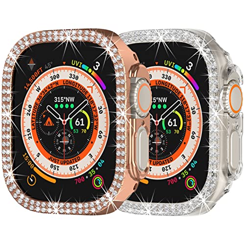 Compatibile con Apple Watch Ultra 49 mm Doppia fila Bling Diamond Case PC Paraurti Custodie Donne Ragazze Cristallo Lucido Strass Custodie Smartwatch Accessori (Trasparente + Oro Rosa)