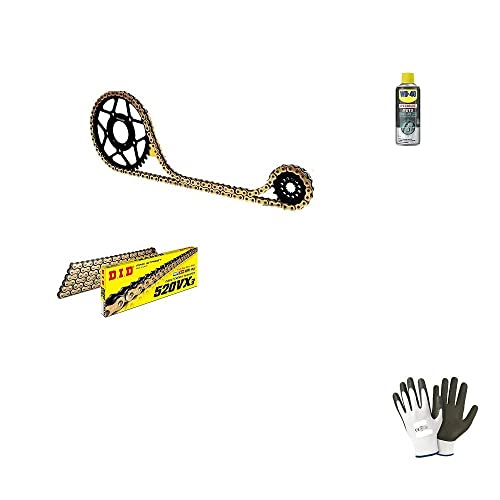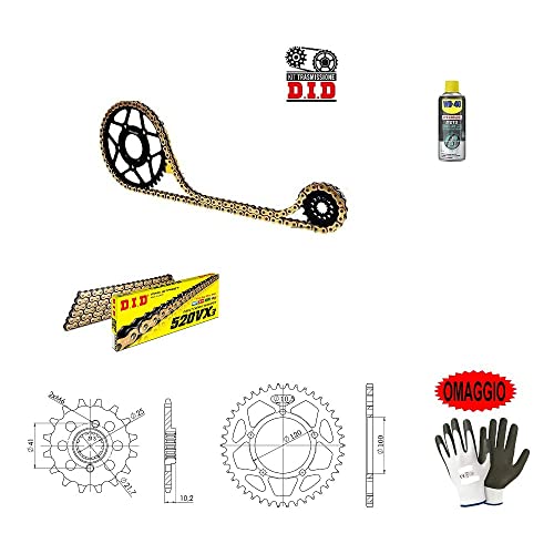 DESCRIZIONE E CARATTERISTICHE PRODOTTO: KIT CATENA-CORONA-PIGNONE- KIT TRASMISSIONE S-AC 15-44-110 DID520VX3 (GeB) R comprende: - CATENA DID 520VX3 (GOLD e BLACK) - LUNGHEZZA: 110 MAGLIE CON GIUNTO A RIVETTO (ZJ) - PIGNONE P520 - Z15 (DIS.20509) - CORONA IN ACCIAIO P520 - Z44 (DIS.35801) - SPECIFICO PER LA TUA MOTO - OTTIMA QUALITA' E PRESTAZIONE